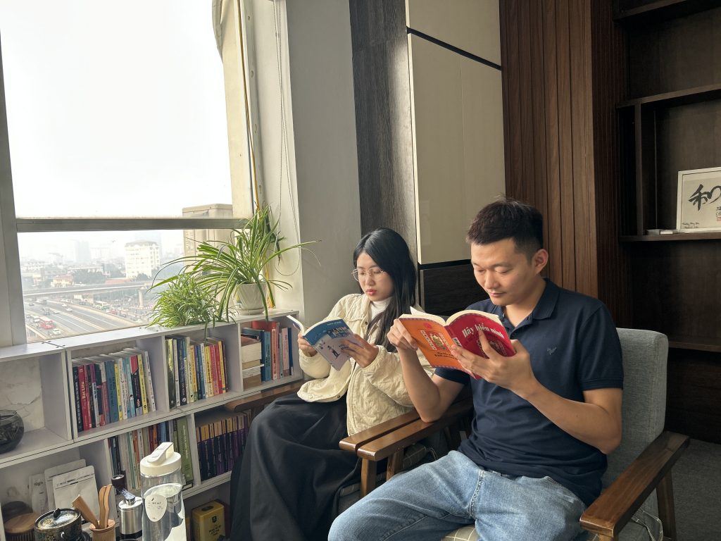 Tại IKI, sách không phải chỉ là vật trang trí, mà là người bạn đồng hành thiết yếu trong công việc hàng ngày. Mỗi góc văn phòng, mỗi bàn làm việc đều có những cuốn sách chuyên môn, sách về lãnh đạo, phát triển bản thân, hay sách về Thiền, về các lĩnh vực khác nhau trong cuộc sống.